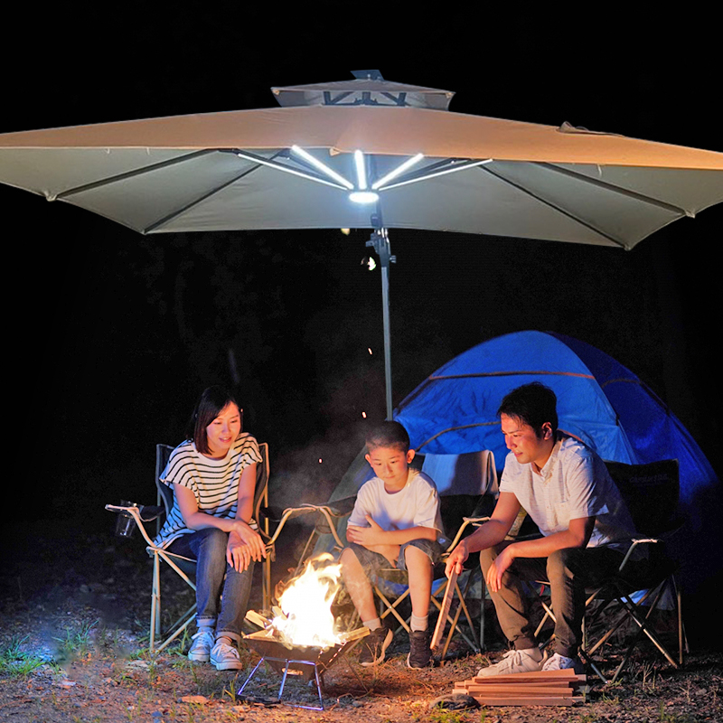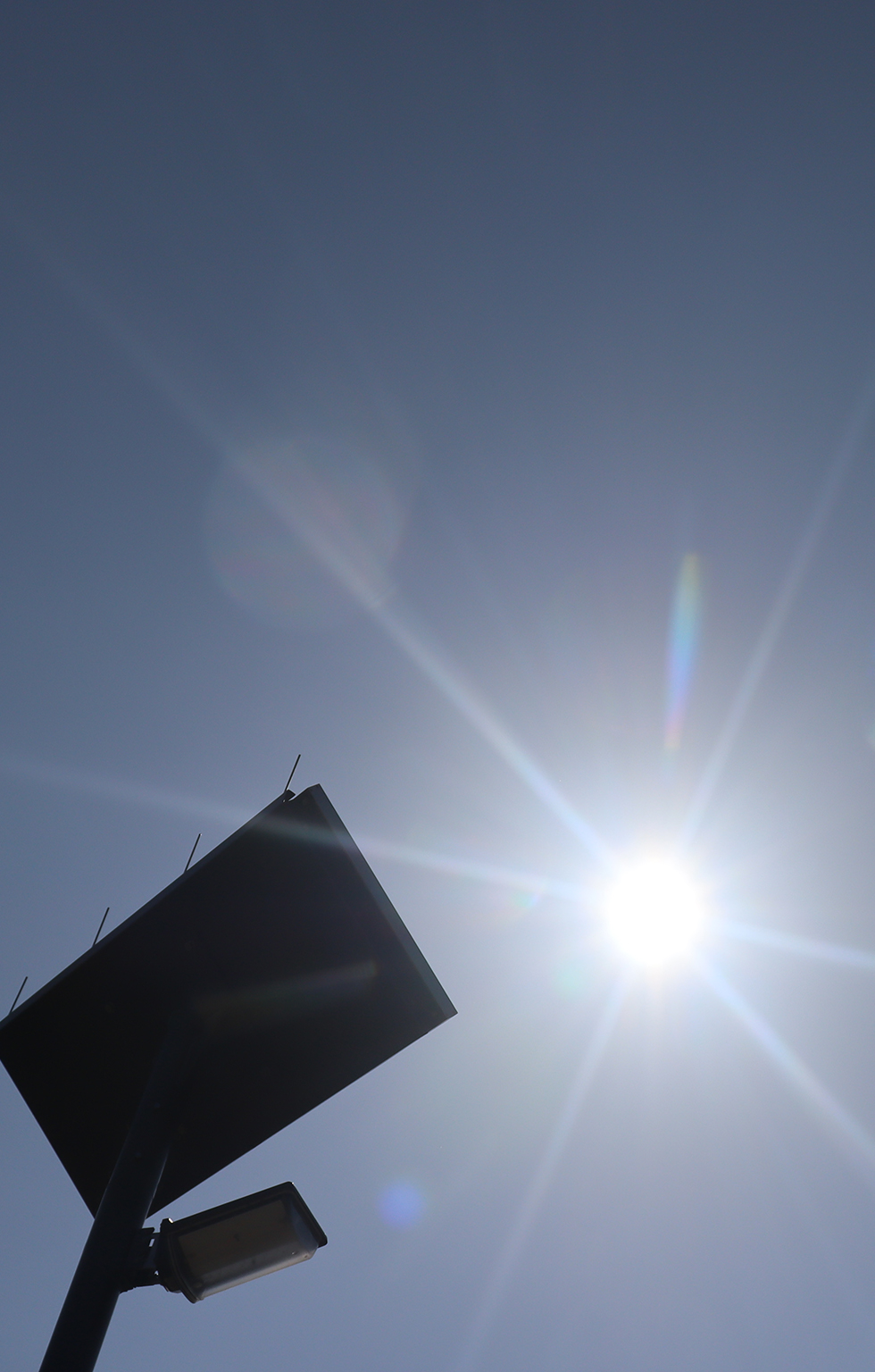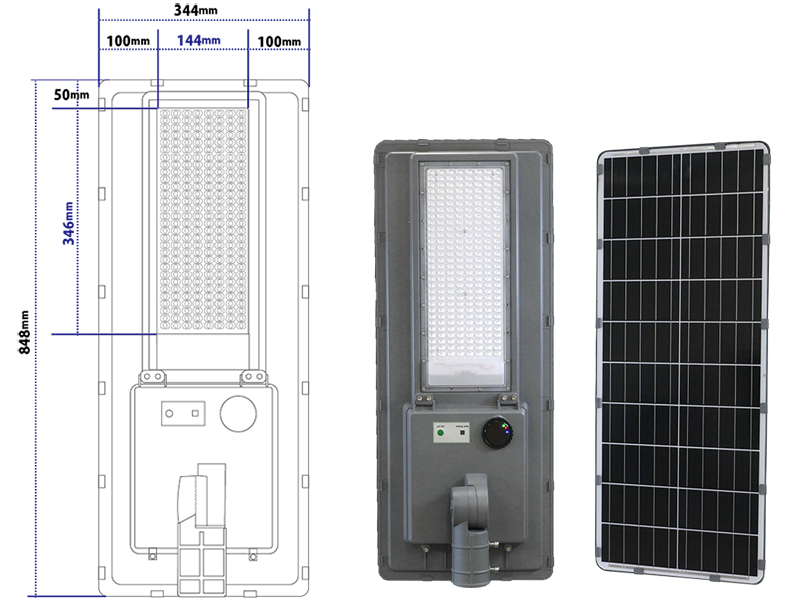 344×846mmの大型ソーラーパネルによる高発電効率。144×346mmの大型LED照明が公園・庭園・商業施設・避難施設・駐車場・マンション・歩道など明るく照らします。