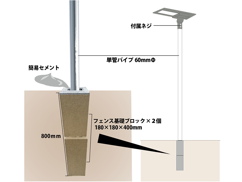 ソーラーパネルとLED照明の一体型。ポール単管60mmサイズに付属ネジで固定するだけ。角度調整も簡単です。電源が不要なので、太陽光を受ける場所であればどこでも設置することが可能です。電気工事の必要がなく、設置後、すぐに使用することができます。